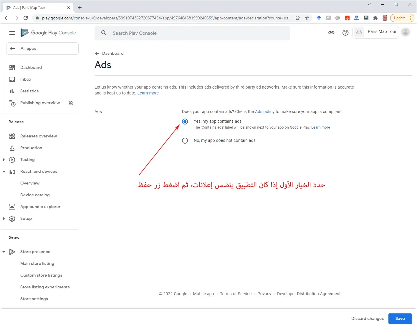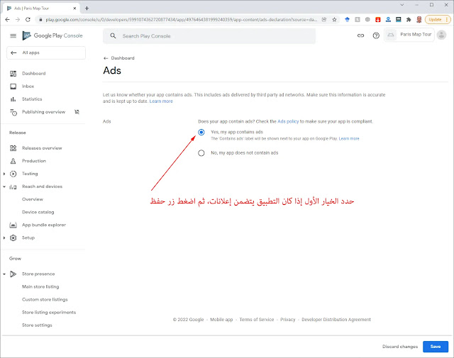 نشط الخيرا الأول إذا كان يتضمن التطبيق إعلانات. ثم اضغط زر حفظ Save بالأسفل.